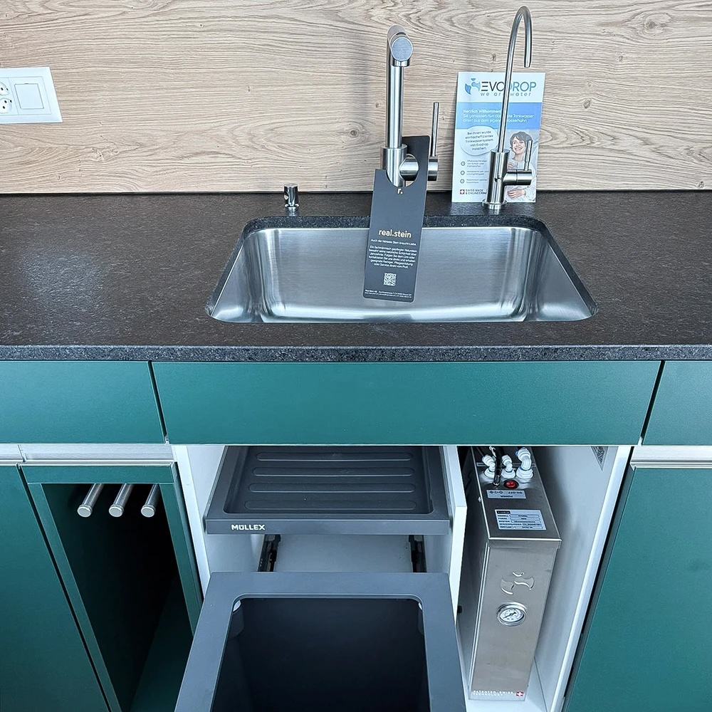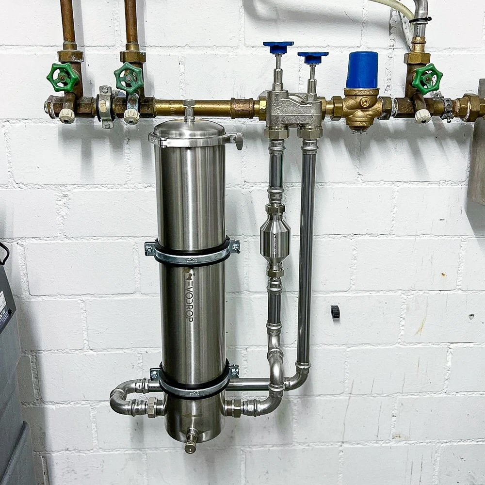 The EVOdescale system is Evodrop’s flagship solution for whole-house water decalcification and quality improvement. Designed as a sustainable alternative to traditional salt-based softeners, EVOdescale protects plumbing and appliances by preventing limescale formation without releasing salt, using electricity, or producing waste water. Its patented technology employs a granulated malic-acid-based filter that binds with hardness minerals, ensuring water remains soft and scale-free throughout the home while preserving essential mineral content and taste. The system is built with high-grade stainless steel and integrates hygienic barriers to maintain water purity.