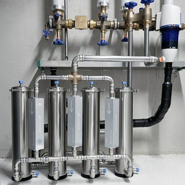The EVOdescale system is Evodrop’s flagship solution for whole-house limescale protection and water quality improvement. Designed as a sustainable alternative to traditional salt-based softeners, EVOdescale protects plumbing and appliances by preventing limescale formation without adding salt, consuming electricity, or producing wastewater. Its patented technology uses a granulated, malic-acid-based filter medium that binds to hardness minerals, helping keep water soft and scale-free throughout the home while preserving essential mineral content and taste. The system is built with high-grade stainless steel and integrates hygienic barriers to help maintain water purity.